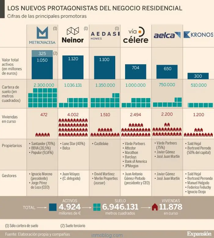 Las principales promotoras inmobiliarias en las que han invertido los fondos de inversión, aprovechando el respaldo financiero y la liquidez de las entidades internacionales, son Metrovacesa, Neinor Homes, Vía Célere, Aelca, Aedas, Gestilar, Testa y Kronos.