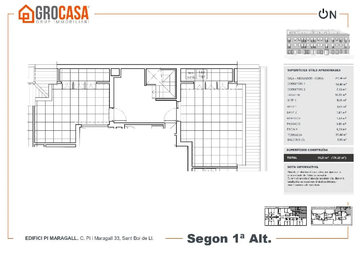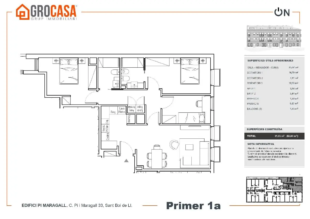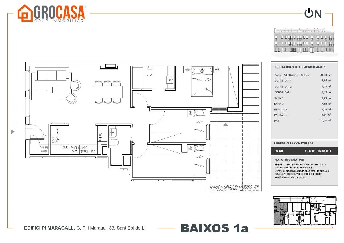 La flamante promoción de obra nueva del Edifici Pi i Margall, en pleno centro de Sant Boi, supondrá la construcción de 16 nuevas viviendas de gran categoría para diferentes tipos de unidades familiares. Están previstas viviendas de 2, 3, y 4 habitaciones, con posibilidad de parking para cada una de ellas. Cuatro unidades ya fueron vendidas.